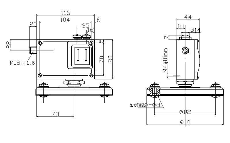 安裝(或拆卸)控制器時要特別注意:防止傳感器(法蘭盤)與開關(guān)殼體發(fā)生相對轉(zhuǎn)動。 若客戶對法蘭尺寸有特定要求,可協(xié)商定制。